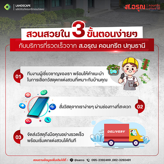 3. รับสินค้าถึงมือคุณเร็วทันใจ ไม่ต้องรอนาน! เราจัดส่งวัสดุถึงมือคุณอย่างรวดเร็ว พร้อมเริ่มตกแต่งสวนได้ทันที